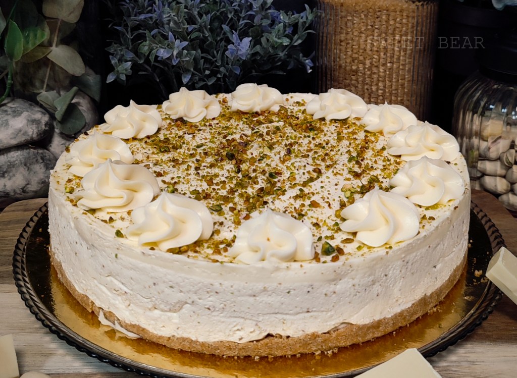 Una combinación diferente, el dulce del chocolate blanco y el punto salado de los pistachos unidos en una mousse con una capa de crema de chocolate.