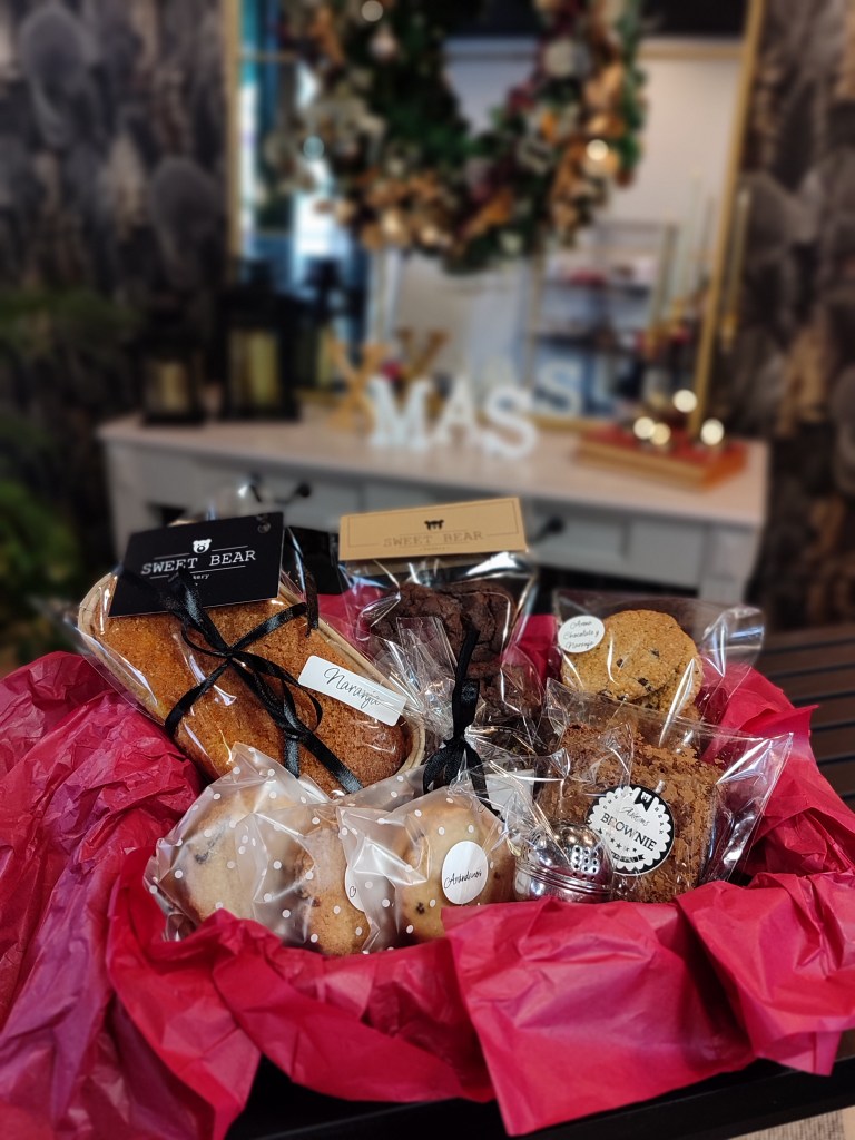 Mini bizcocho, Tarro de Fuciños de Red Velvet (1 ud), Galletas de Arándanos (6 uds.), Galletas de avena chocolate y naranja (6 uds.), Brownie de Nutella, Mini chocobrownies (6 uds.), Bolsita de Infusión, Infusionador de metal, Cookie XL, Flores.