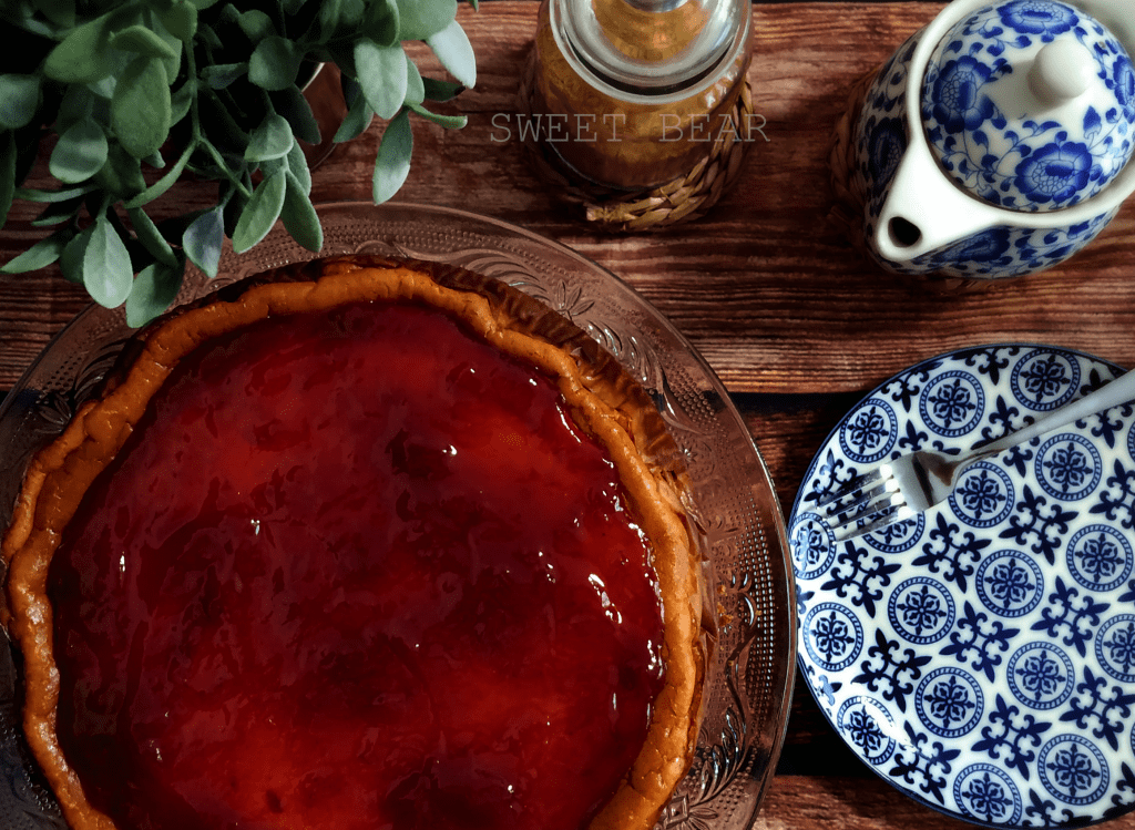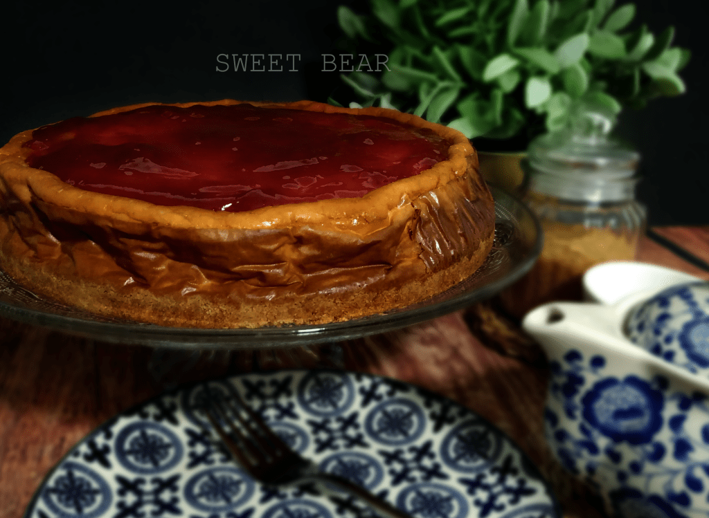 Cheesecake al horno con base de galleta sin trigo y un interior cremoso de queso y cubierta por confitura de fresas.
