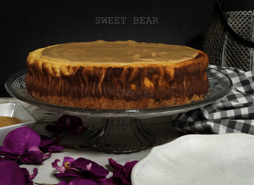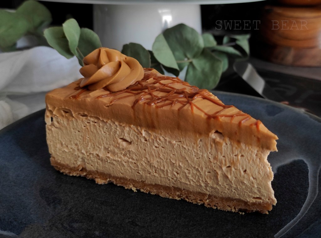 Cheesecake al horno con base de galleta sin trigo y un interior cremoso de queso y cubierta por una crema de dulce de leche.