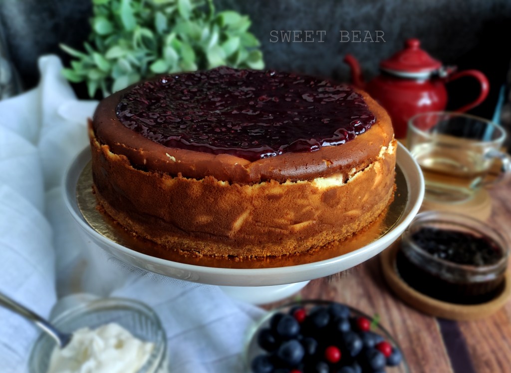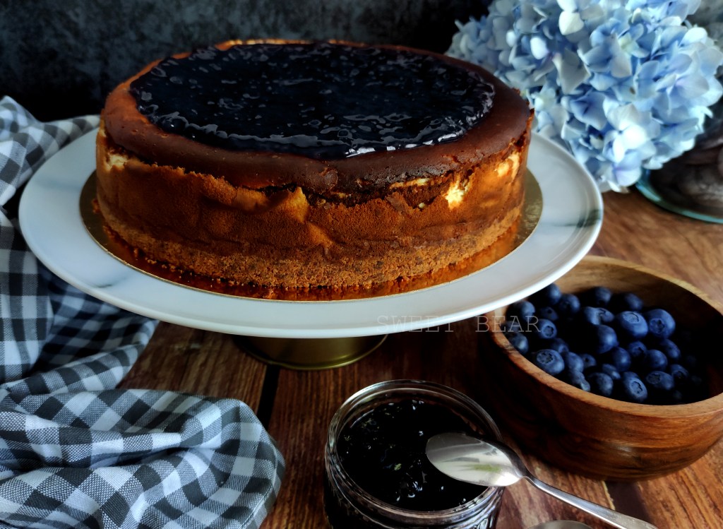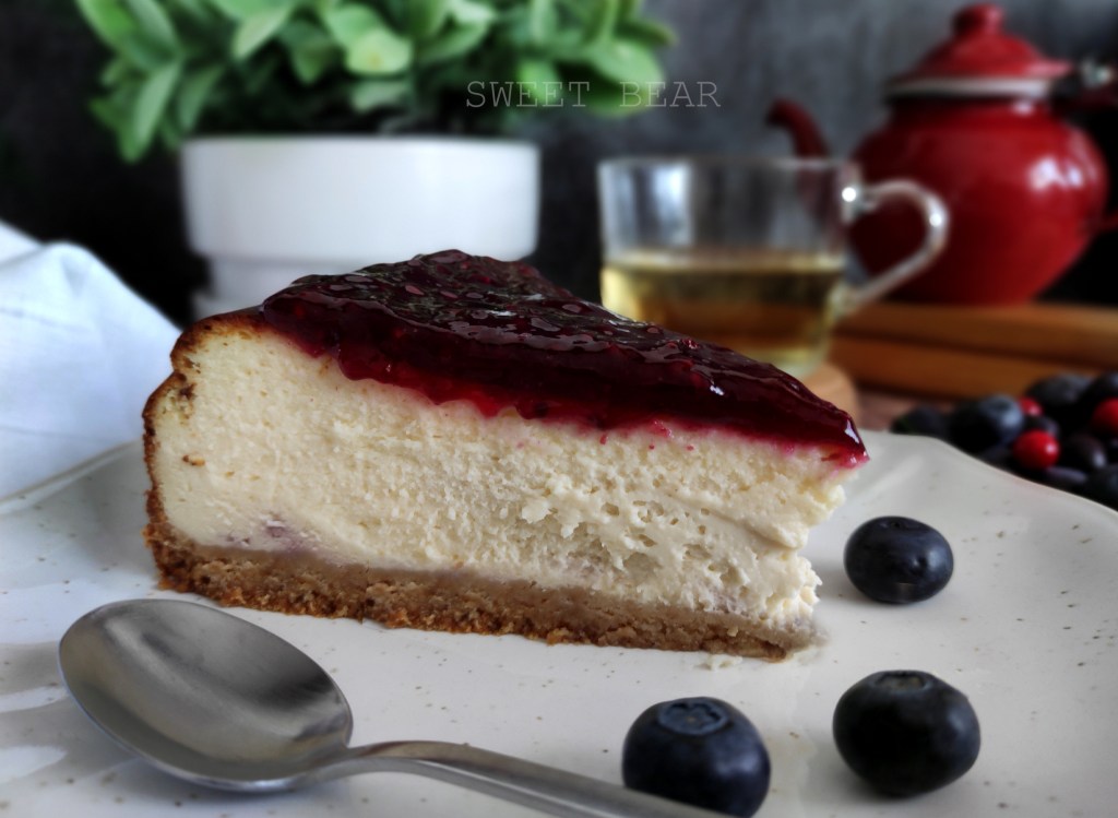 Cheesecake al horno con base de galleta sin trigo y un interior cremoso de queso y cubierta por confitura de arándanos.