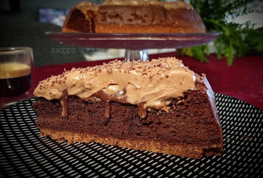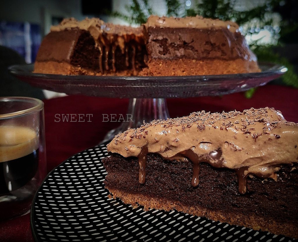 Tarta al horno de chocolate con base de galleta sin trigo y cacao, bizcocho de chocolate sin harinas, ganache de chocolate y avellana y buttercream de chocolate.