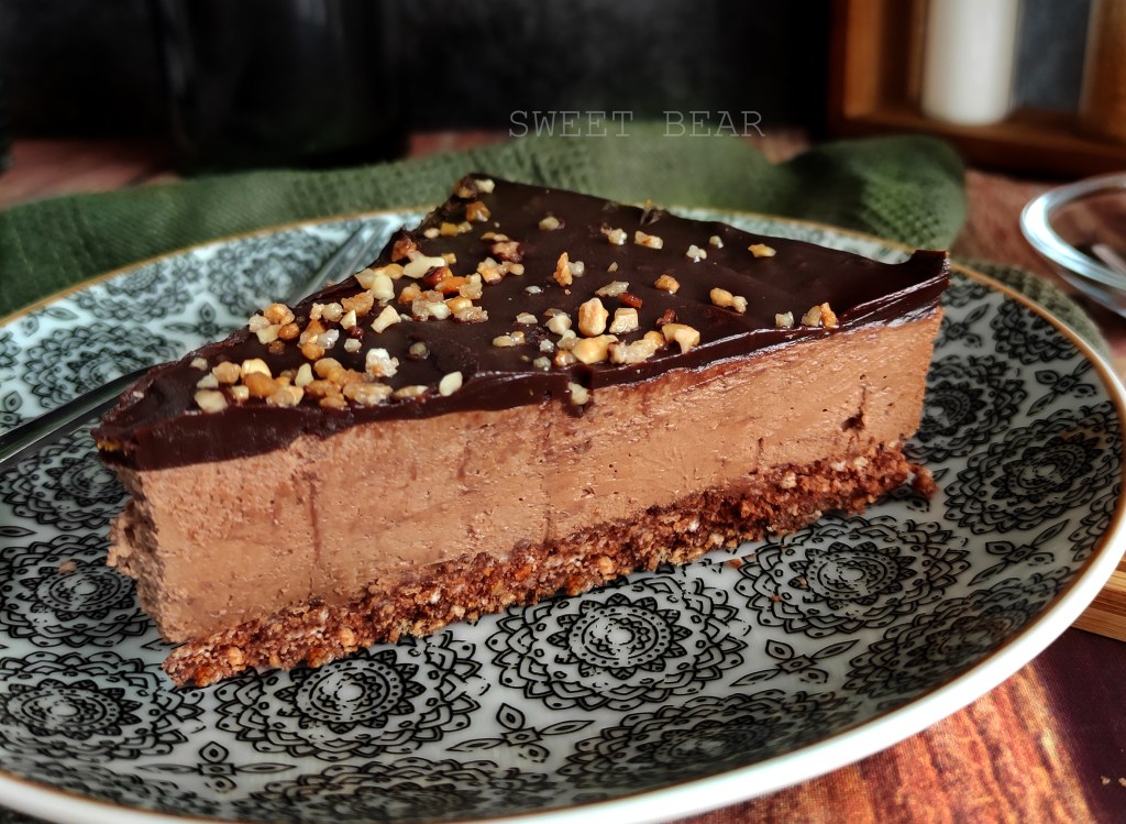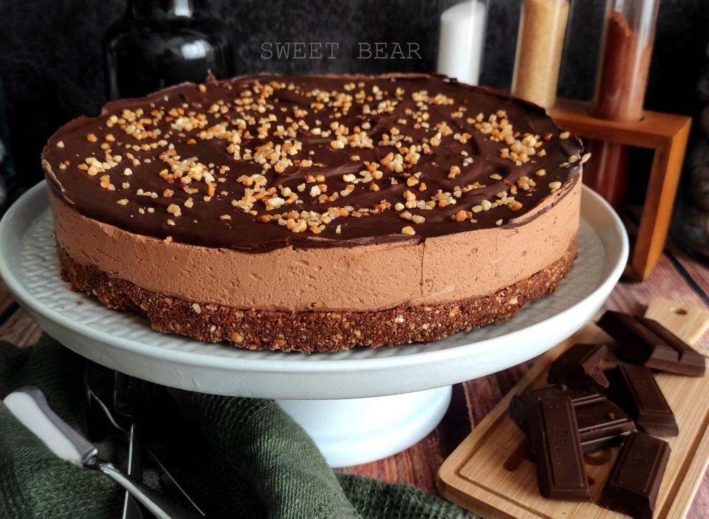 Base de galleta sin trigo, mousse de chocolate blanco con pistacho y una capa superior de buttercream de chocolate blanco y decorada con pistacho troceado.