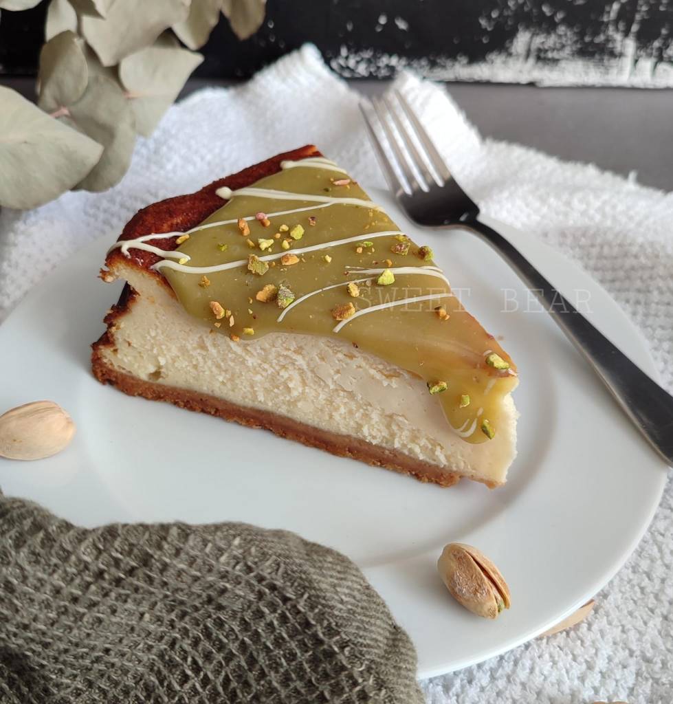 Cheesecake al horno con base de galleta sin trigo y un interior cremoso de queso y cubierta por una crema de pistacho y chocolate blanco y decorada con hilos de chocolate y pistachos troceados.
